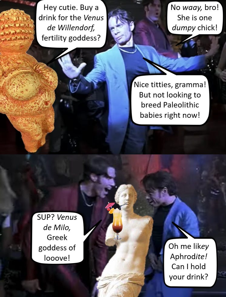 I was recently listening to an audiobook of Camille Paglia’s book Sexual Personae. In it she mention’s the change in goddess statues over the years from being about fertility to later being sexualized. That was the moment the idea for the meme clicked. Not sure how Night at the Roxbury came to mind but the absurdity of guys picking up statues struck me as funny.