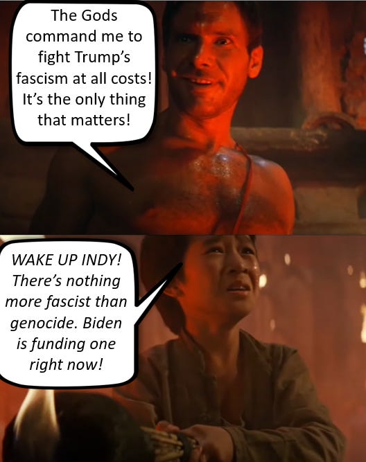 The “Wake Up Indy” meme below is along a similar vein as it involves Israel. But this is from a different angle. The legacy liberal media keeps saying if you don’t vote for Biden democracy will end under Trump’s fascism, and then they play quotes of Trump making inflammatory comments that do have a fascist flare. But we know from living through his presidency that he seldom backs up his hyperbolic rhetoric and his presidency was a shitshow, not a fascist reign.