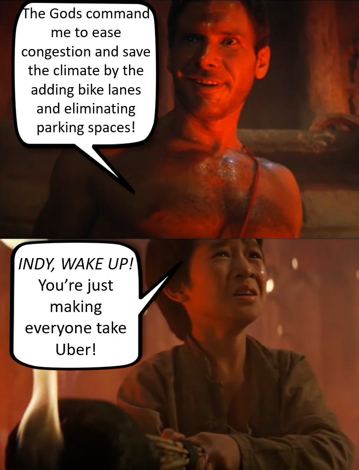 And finely we have my last version of the Indy meme. This is on a lighter and more local topic. Leadership in San Francisco, where I resided for many years, decided that it would be good urban planning to reduce traffic congestion and help the environment if it created a down town area that was unfriendly to drivers, with unnecessary one way streets, blocked streets, elimination of parking places and bike lanes that take up half the road. The goal here was to create a healthy population of bicyclists, clean air and light traffic.