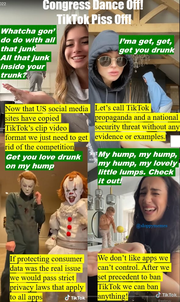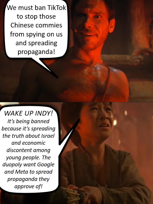 In my top meme Short Round is awakening Indy to the truth about why the government wants to ban TikTok. There’s more to the issue than is covered in the meme, the wheels were turning to ban TikTok before it started educating young people on what is happening in Israel and Gaza, but Israel accelerated the process.