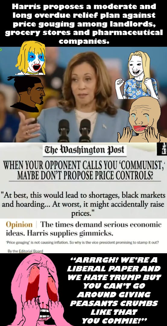 Journalism used to be a working-class profession where people would work their way up from the mail room to city hall reporter. Now newspapers only hire from prestigious universities, meaning those journalists are from the same socioeconomic class as the Goldman Sachs people. They must defend the interests of the ruling class and make the argument for why helping ordinary Americans is against the interests of the economy. Corporate media has been telling its audiences for a while now that the economy is actually doing great according to their inflated metrics and people shouldn’t believe their lying eyes when they look at the grocery bill. Their claim that price caps would cause shortages is totally false -- it would only cut into unprecedented corporate profits. Conservative outlets like FOX news rolled with the Post story because it would help their ridiculous narrative that a neoliberal like Kamala Harris is a socialist.