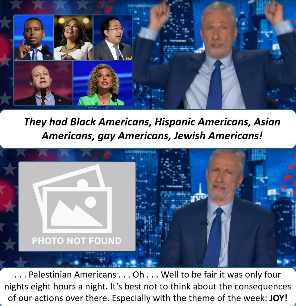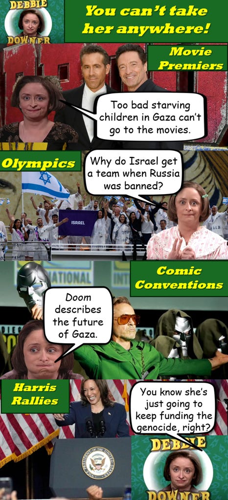 But you know what? It’s summertime and as an American you have a lot of events to choose from. After I saw Deadpool and Wolverine I realized the summer Olympics had begun and it was San Diego Comic Con that weekend, and the enthusiasm among Democrats for the Kamala Harris campaign was skyrocketing. Plus, global warming has made for some great beach weather and its music festival season. This reminded me of an old recurring SNL skit where a group of friends would be together doing a fun activity, but Debbie Downer would be there to mention some depressing item in the news and ruin the occasion, cue a horn would blaring WHAAA WHAAA! So now when I see a celebrity or a friend either ignore the issue of Gaza or voice their support for Biden/Harris I have a Debbie Downer in my head saying “what about Gaza? How can you be so superficial that you don’t care about the worst atrocity of our time?” And this thought colored my perception of every aspect of the Democratic convention.