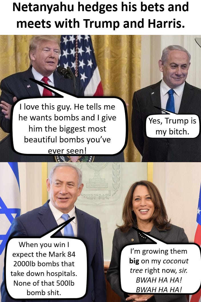 Following his visit with congress Netanyahu met with both presidential candidates to ensure their support. Both candidates have promised unconditional aide to Israel. The only difference is how they talk about it. The Biden administration make statements about how bad they feel about the loss of innocent life and have leaked negative information to the press about Netanyahu, signaling they would prefer to deal with a more centrist leader. Trump has uglier rhetoric saying, “You’ve got to finish the problem.”