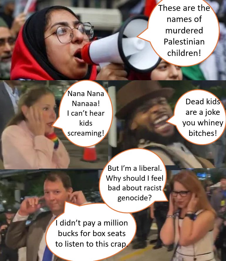 This is from a clip that went viral that showed DNC attendees covering their ears as the names of murdered Palestinian children were being read from protestors. One person even mocking the idea of the dead children. These are the selfish scum that identify as anti-racist “liberals.”