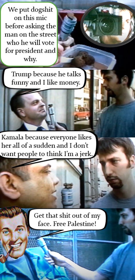 Tom Green had a hilarious bit on his show in the 90s where he put shit on his microphone, then with a dead pan expression and a professional TV crew behind him, did man on the street interviews. The people would squirm at the smell of shit but they would answer the questions because he seemed like a legitimate TV guy. It came back to my mind recently and I realized it would make a great meme format where you have people saying how much they love things the media has brainwashed them to accept. In this case it is the two-party system where Americans are taught to love one terrible candidate and hate the other. The idea that there could be a third option has been erased from their minds: third parties are spoilers, bad.