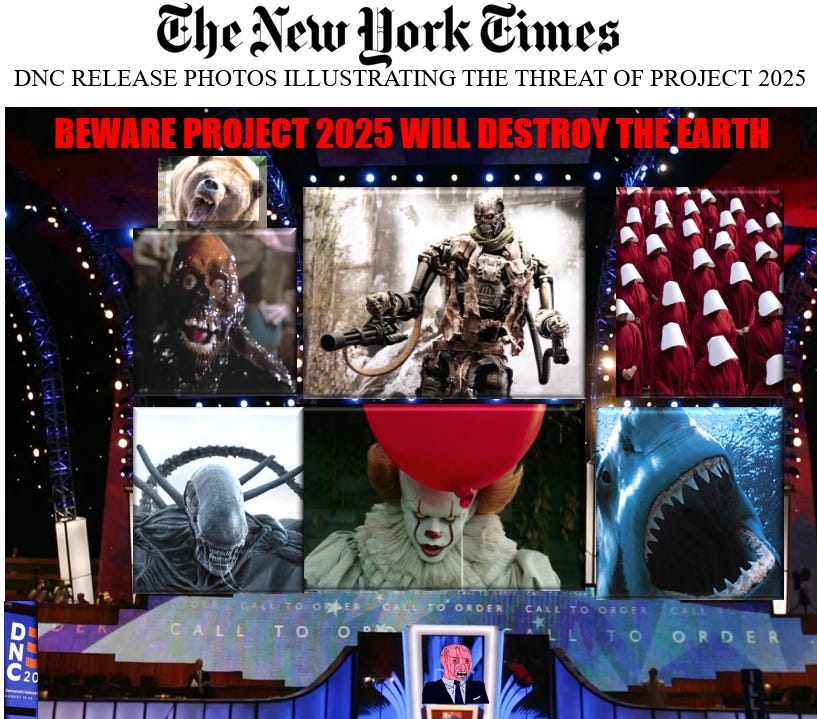 The Democrats don’t have a lot to run on — mostly just abortion. But they do have something to run against: Trump. However, the hysteria over the Trump threat needs an enhancement. What if there was a right-wing conspiracy to overthrow the government and install a fascist dictatorship? That sounds like an extension to what they have been saying about Trump all along and is the fearmongering that was pushed at the Democratic convention all week: BEWARE PROJECT 2025 WILL DOOM AMERICA! Project 2025 is a proposal by conservative think tank the Heritage Foundation who for decades have put together proposals for Republican policy. Republican politicians historically have gone with some of their proposals and ignored the ones that are politically unrealistic. Trump’s public statements distancing himself from a lot of Project 2025’s ideas is the latest example. It’s not a take-all deal at all. If the president could suddenly decide the executive branch is all powerful than why didn’t Trump do it when he was president before? I do like the idea in the proposal that they will get rid of all the people who work for CIA/FBI/NSA, but I don’t trust that the Trumpers they would put in their place would be any better. And we know from the way the intelligence agencies persecuted and undermined Trump when he was in office that they are more powerful than the president.