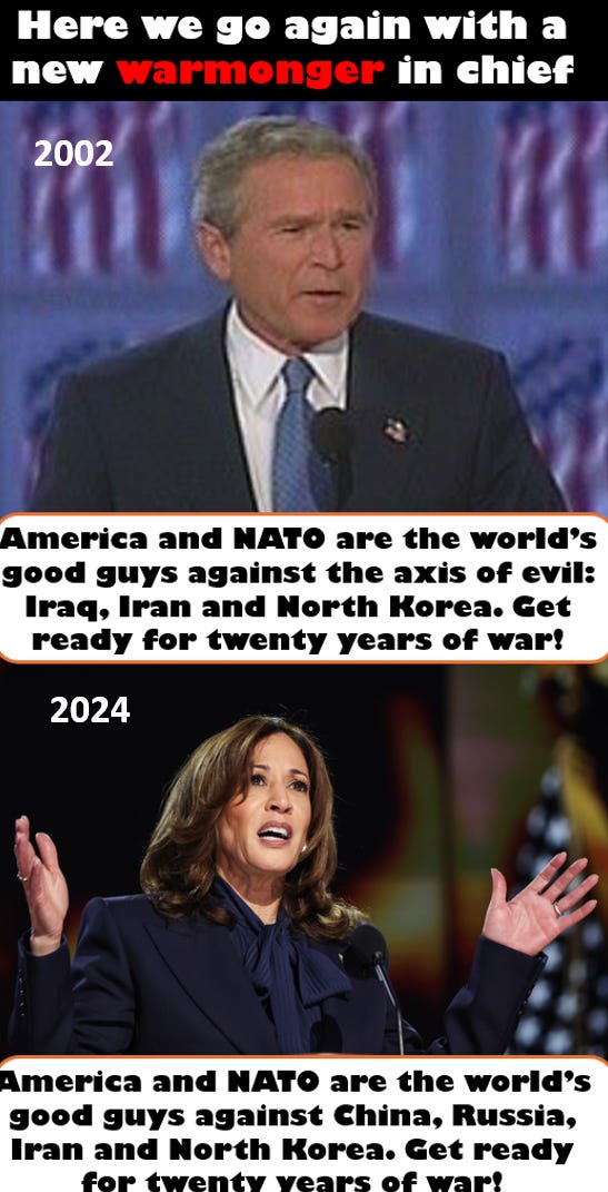 Harris’s acceptance speech made neoconservatives very happy. It was a return to the hawkishness of the Bush administration. Over the years neoconservatives who led us into the wars in Iraq and Afghanistan have migrated to the Democratic party where they are getting us into wars with Russia, Iran and (they hope) China. This is why an old-school neocon like Lindsay Graham loves Biden’s policies in Isreal and Ukraine. In her speech Harris identified the countries that are America’s enemies and promised US military strength. This was a speech that could have been given by George Bush. The war in Ukraine, which has resulted in hundreds of thousands of casualties and decimated a generation of Ukrainian men, will continue indefinitely even though there is no chance of victory. The suffering could have been ended by peace talks two months into the conflict, but this was stopped by the Biden administration. This coupled with what is happening in Isreal has left Biden with so much blood on his hands. Blood that will soon be on Harris’s hands.