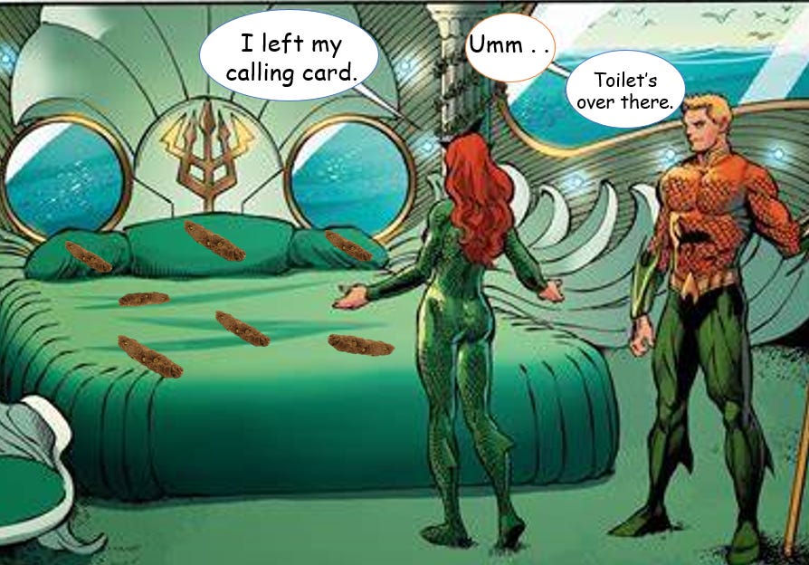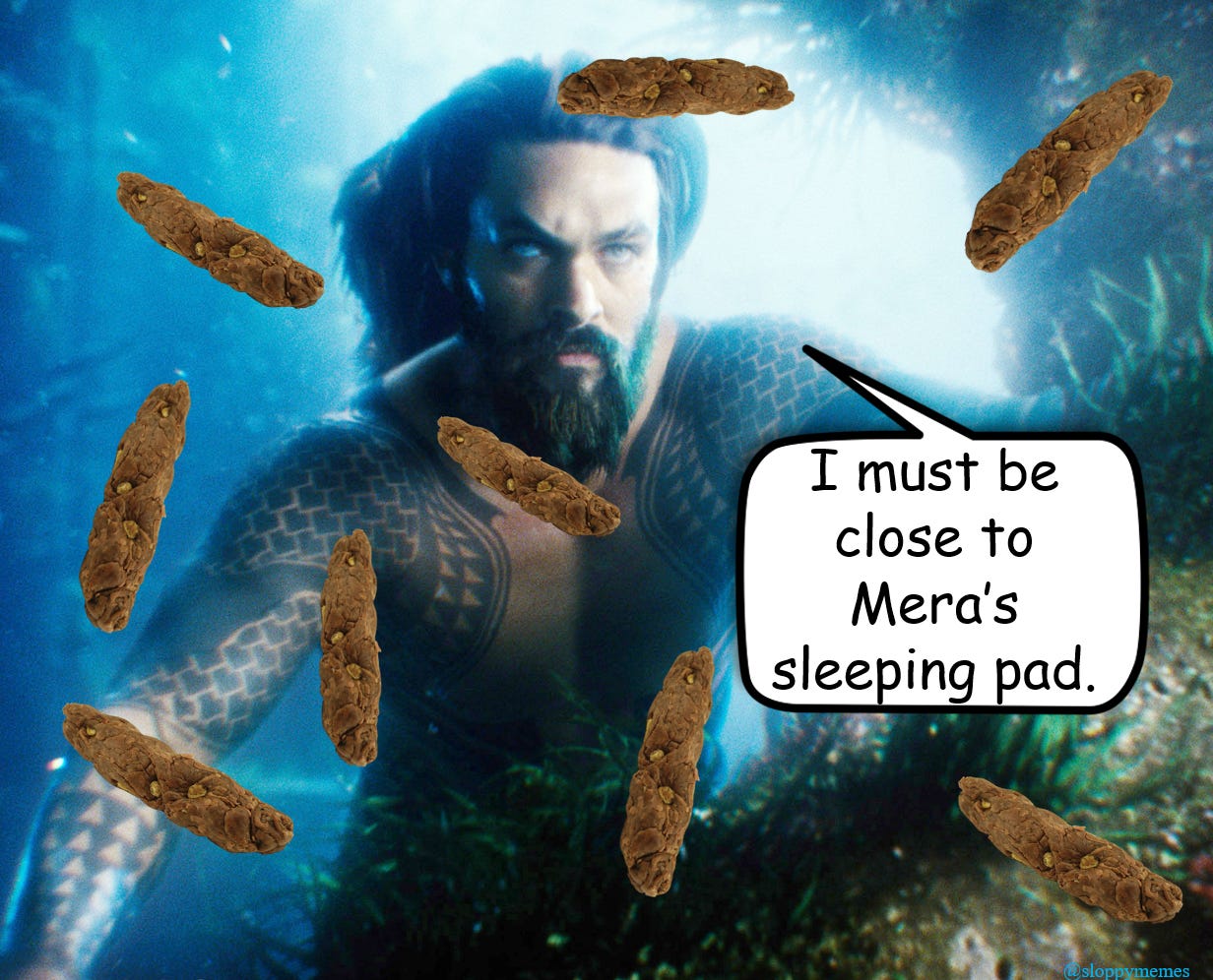 Remember the Johnny Depp / Amber Heard trial? Of course you do. And what do you remember best? That Heard shit the bed. My humor is somewhat scatological, and I have this turd transparency that I like to work into as many memes as possible. Amber Heard plays Mera in the Aquaman movies so if Aquaman was swimming around close to Mera’s sleeping pad he would find himself surrounded by floating turds and hilarity would ensue.
