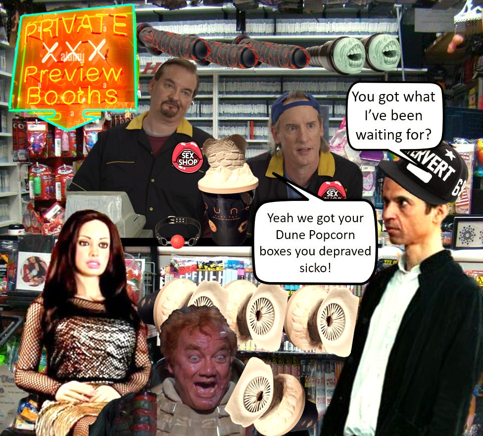 Soon after its release there was an SNL skit about teenagers spending the night with the bucket. But my meme is funnier. I thought why couldn’t the bored sarcastic (and aging) cast of Clerks not work at an adult bookstore? This is the perfect opportunity to meld dirty sex jokes with pop culture references. The blow up doll is from the film Lars and the Real Girl and the pervert is Caveh Zahedi from a documentary film only San Francisco natives would be familiar with, I Am a Sex Addict. At the bottom is the villain the Baron Harkonnen from the David Lynch version of Dune. His character is a sex creep as well so this works. Also funny to put a bunch of big black dildos in the meme and and get away with it.