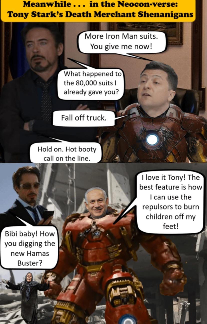 The neoconverse sequel is about something more important than the woke, anti-woke debate. When I posted this two months into the Israel’s war on Gaza there was some talk among neoconservative Democrats, “oh no, Israel are going to get all the arms? What about funding the war in Ukraine?” And the meme comments on this concern and how if Tony Stark were supplying these wars, he would be getting tired of Zelenskyy’s constant demand for new weapons, and excited for Bibi’s new war. Much of the arms supply America gives Ukraine is instantly gone as the corrupt leadership steals from shipments and sells them on the black market. A CBS report that came out about this early in the war was quickly censored after Ukrainian leadership objected, so accurate reporting on how much is being stolen has not been done. But even Zelenskyy himself has admitted in an interview “people are stealing like there’s no tomorrow,” and has had to fire leaders who stole too much for him to cover up.