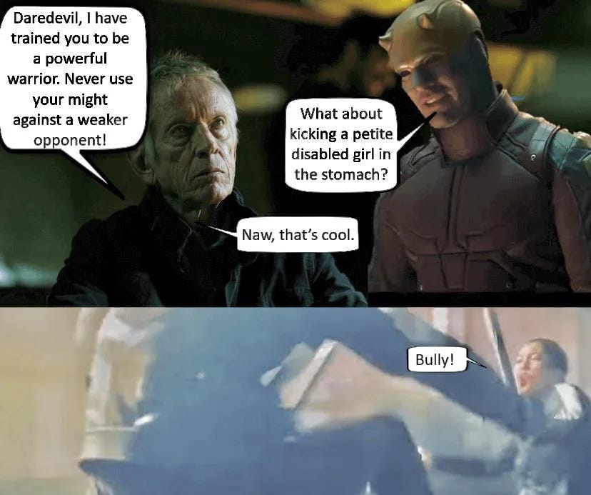 BELOW: In the Disney+ show Echo, the main protagonist is a deaf amputee who has ultimate fighting powers that copy her opponents’ abilities. In a poorly choreographed trailer for the show a much larger Daredevil is kicking her around and it doesn’t seem fair. Is it anti-feminist to say a big man kicking a disabled woman is a bad look?