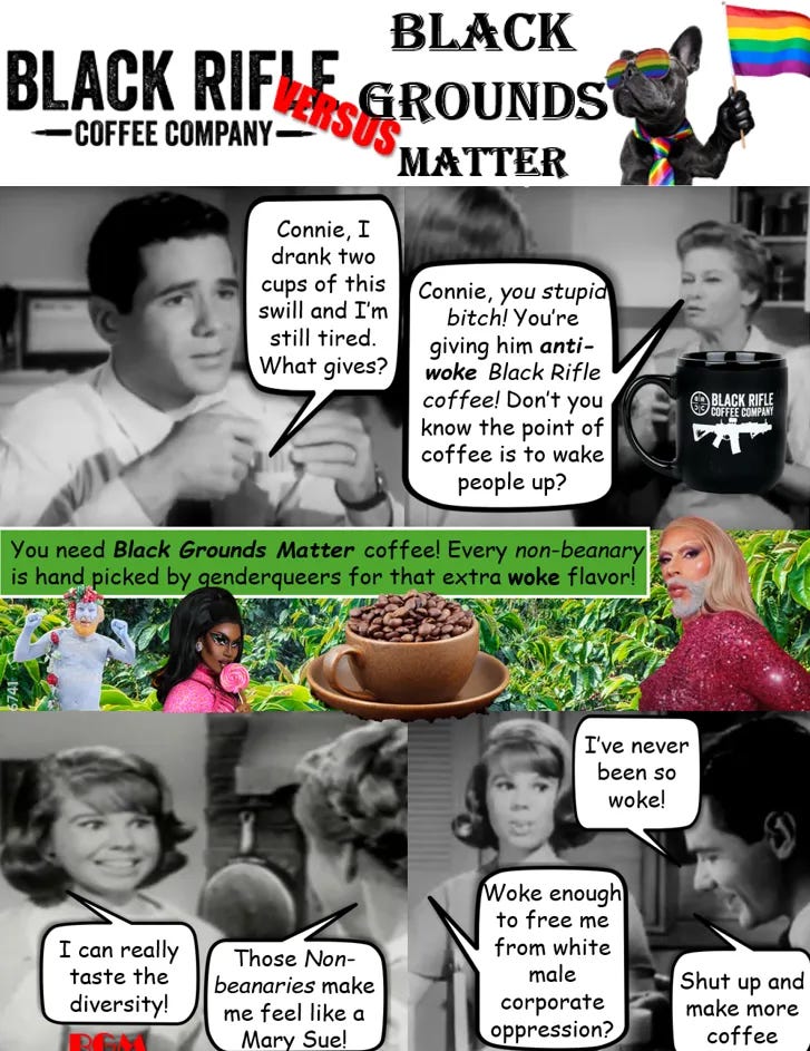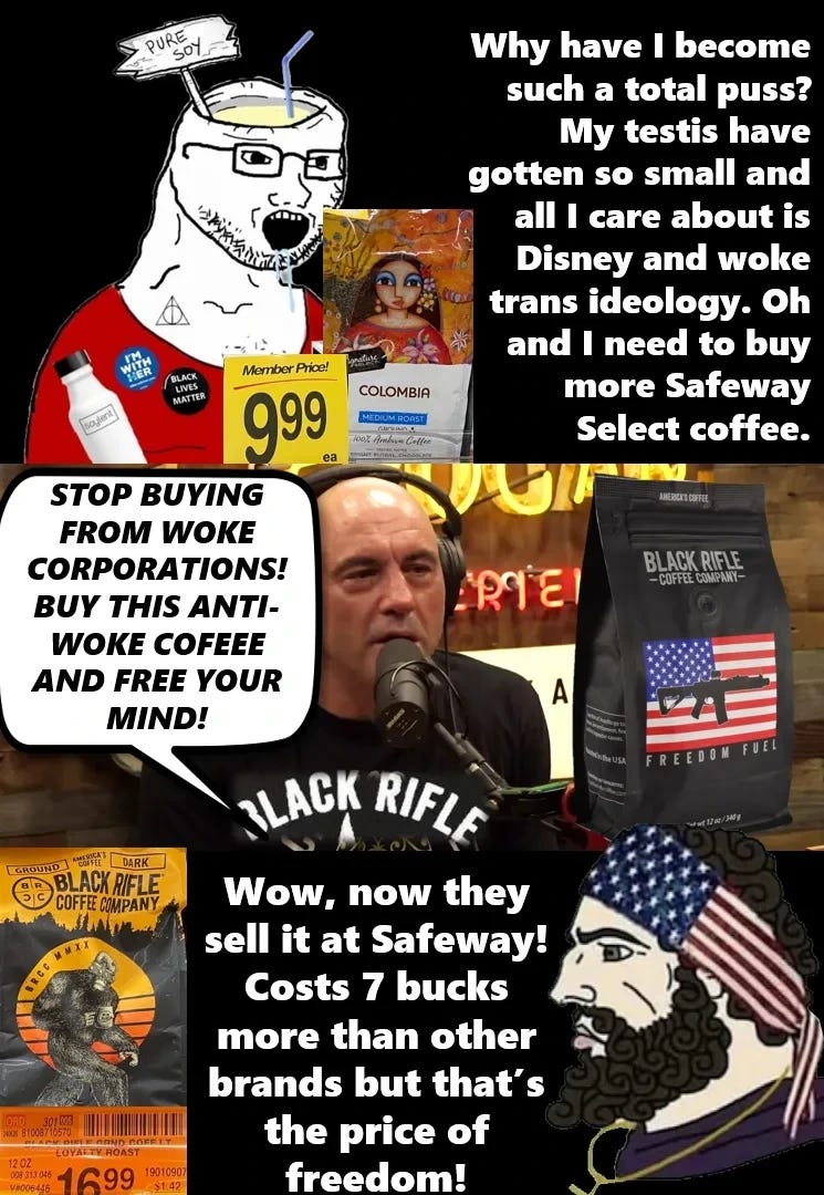 I had only heard of Black Rifle Coffee from Rogan’s podcast and have never ordered coffee online. Why bother when I can just get it at the store? I was curious though when I saw it on the coffee aisles at Safeway. But the price . . . 16.99 for a 12 ounce bag when the other brands are 8.99 to 10.99? It’s expensive being anti-woke I guess. People really hate Biden for all the inflation that has been happening on his watch. So let’s show those libs by paying through the nose for coffee.