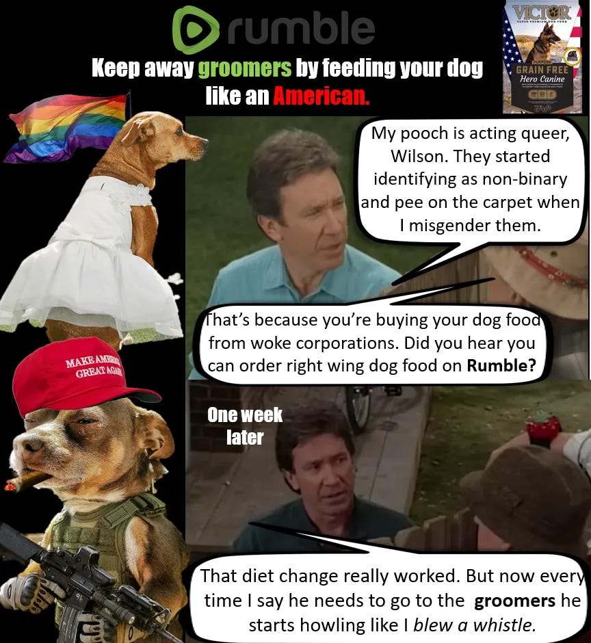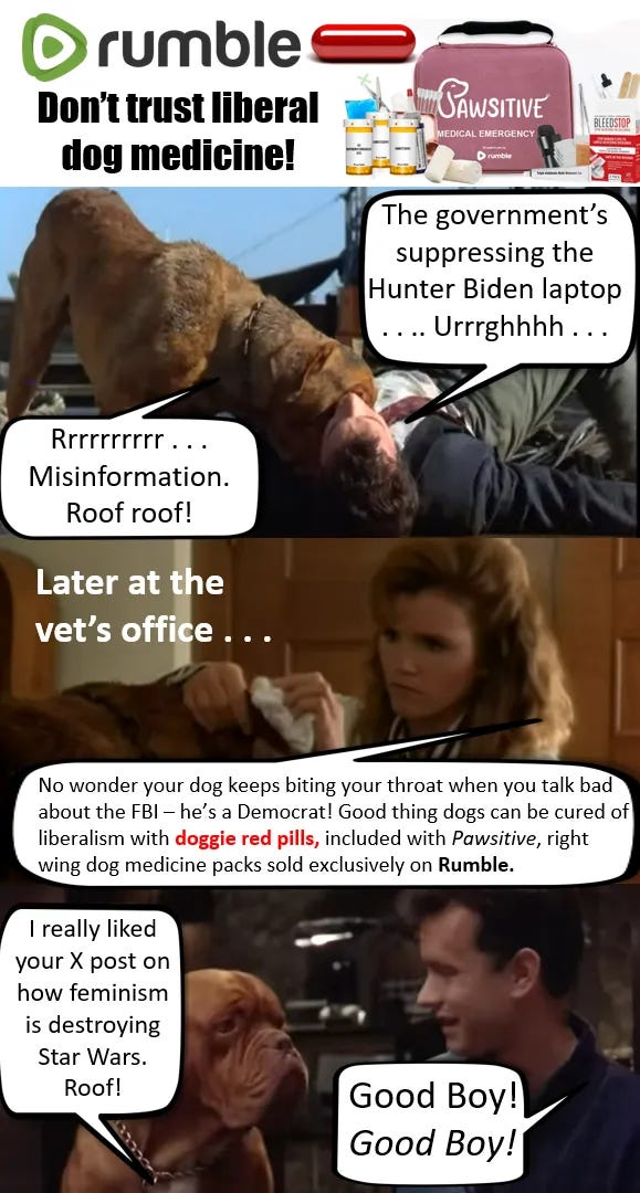 Rumble are marketing products that formally had no political affiliation — like dog food and medicine — with the promise they are made by corporations that share the viewers’ conservative values. But how would you even know these companies are truly conservative? Budweiser have commercials that pander to liberals, but they also have commercials that pander to conservatives. They are willing to say anything they have to in order to sell their products, and these new companies who have found a right-wing target demographic are no different. Rumble is not the only company to do this, there are websites where you can buy the right-branded versions of all kinds of innocuous products.