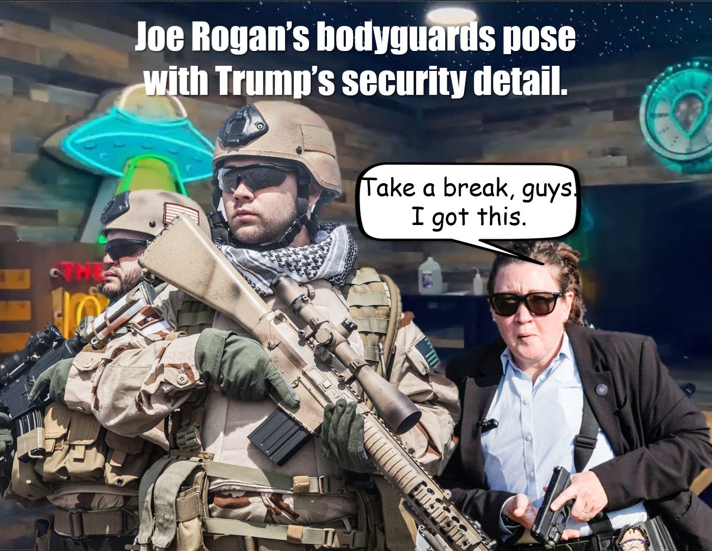 And let me throw in another Joe Rogan meme since I’m on a tangent. It’s based on Rogan having ex-Navy seals as his security while Trump had some short women bumbling with their guns during his assassination attempt. One commenter accused me of being sexist in this one. What do you think?