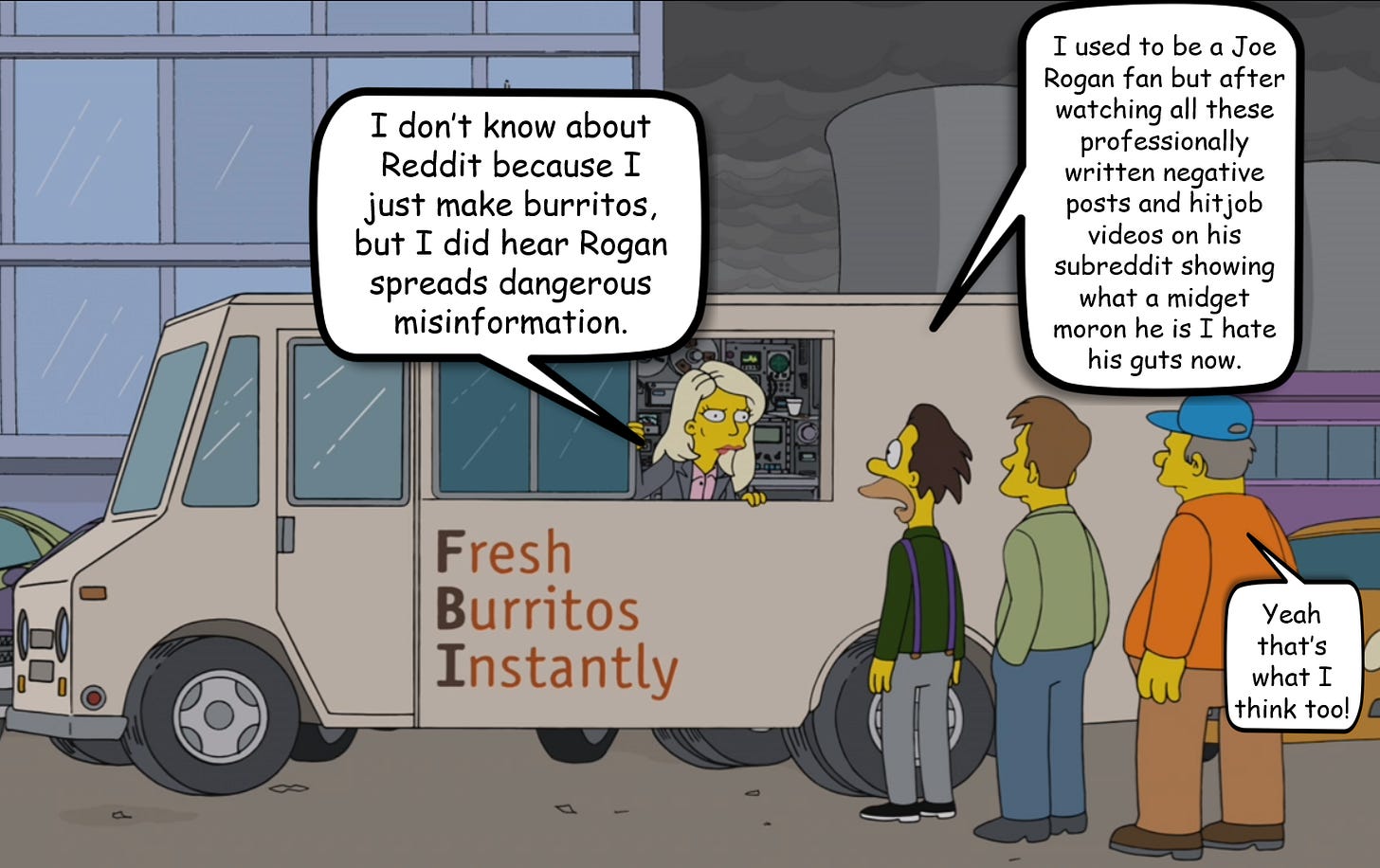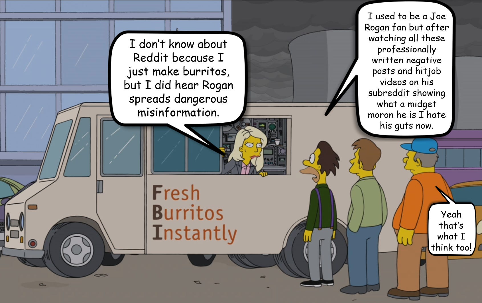 In fact I made the meme below in response to all the anti-Rogan posts that are on his subReddit. Half the people on there are haters. This meme is dated to the Covid days, when Rogan was deemed “Hitler of the week,” (as Matt Taibbi puts it) and there was an orchestrated media campaign to remove him from Spotify.